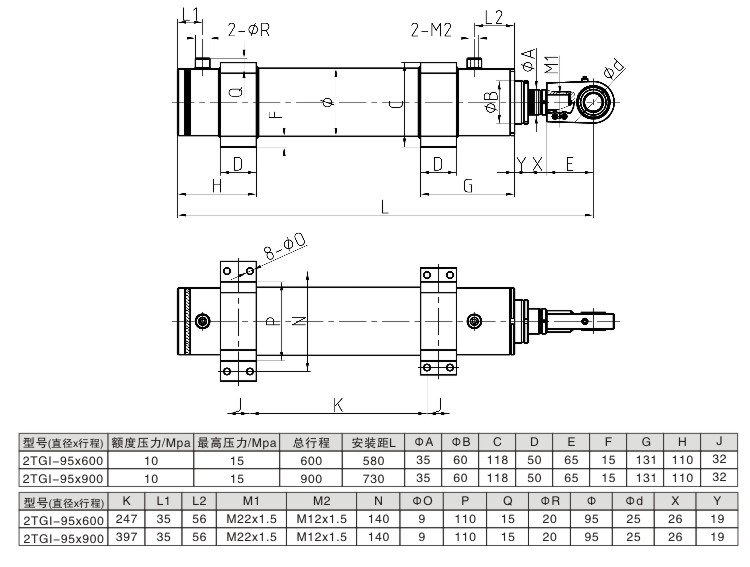 二級伸縮液壓缸 腳座連接外形安裝尺寸圖