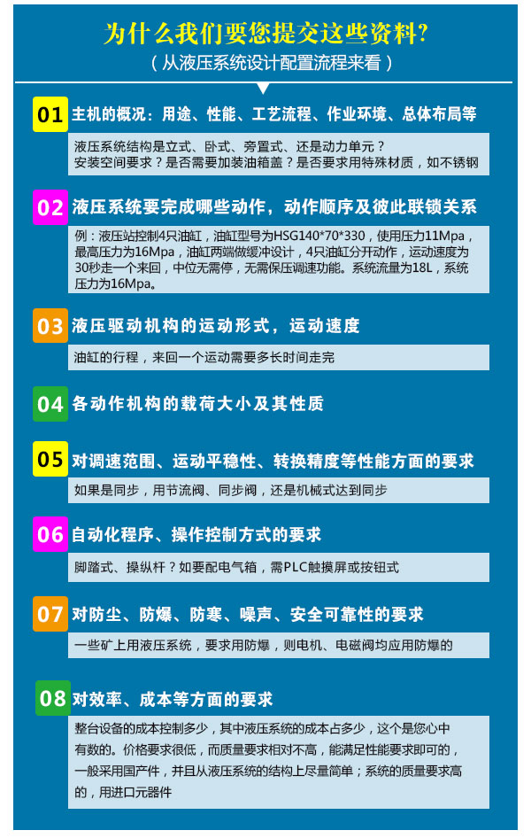 做一臺液壓系統需要客戶提供液壓要達到什么樣的功能要求。液壓系統的整個工作過程。比如一共有幾個油缸或馬達,每個油缸需要達到多少推力,每個油缸的速度是多少是否有變化,以及每個油缸的負載情況。多個油缸時,是否有同時工作或同步要求。(是否變化、還需要提供工作時間、工作環境)