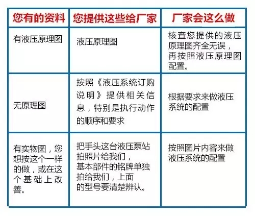 當然,還有第四種情況,您手上只有液壓系統的型號。按照液壓系統型號命名方式,有了型號,我們只知道該液電機功率、閥組數、系統壓力,能大概報價,但做出來的液壓站無法保證滿足需求,原因參考1《液壓系統配置過程》。