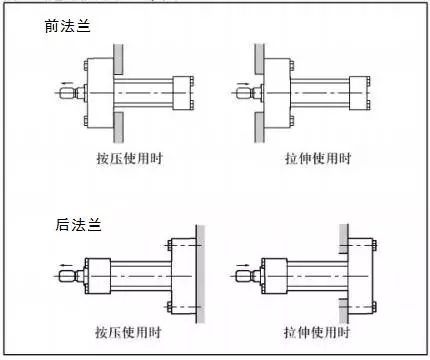 (1)法蘭安裝適合于液壓缸工作過程中固定式安裝,其作用力與支承中心處于同一軸線的工況;其安裝方式選擇位置有端部、中部或尾部三種,如何選擇取決作用于負載的主要作用力對活塞桿造成壓縮(推)應力、還是拉伸(拉)應力,一般壓縮(推)應力采用尾部、中部法蘭安裝,拉伸(拉)應力采用端部、中部法蘭安裝,確定采用端部、中部或尾部法蘭安裝需同時結合系統總體結構設計要求和長行程壓縮(推)力工況的液壓缸彎曲穩定性確定。
