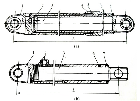圖示 ZG1型柱塞缸 (a) 導向套與缸筒螺紋連接(b)導向套與缸筒焊接